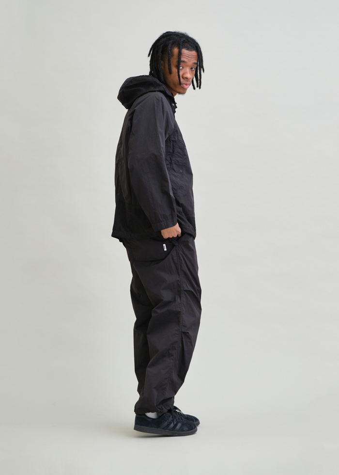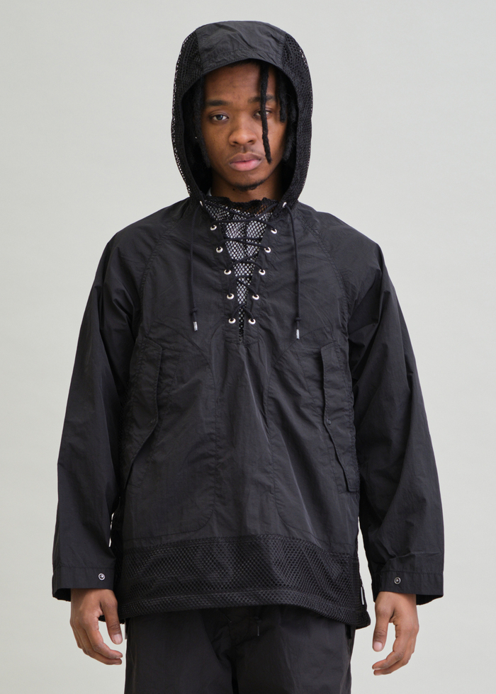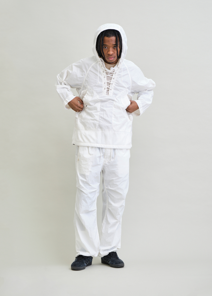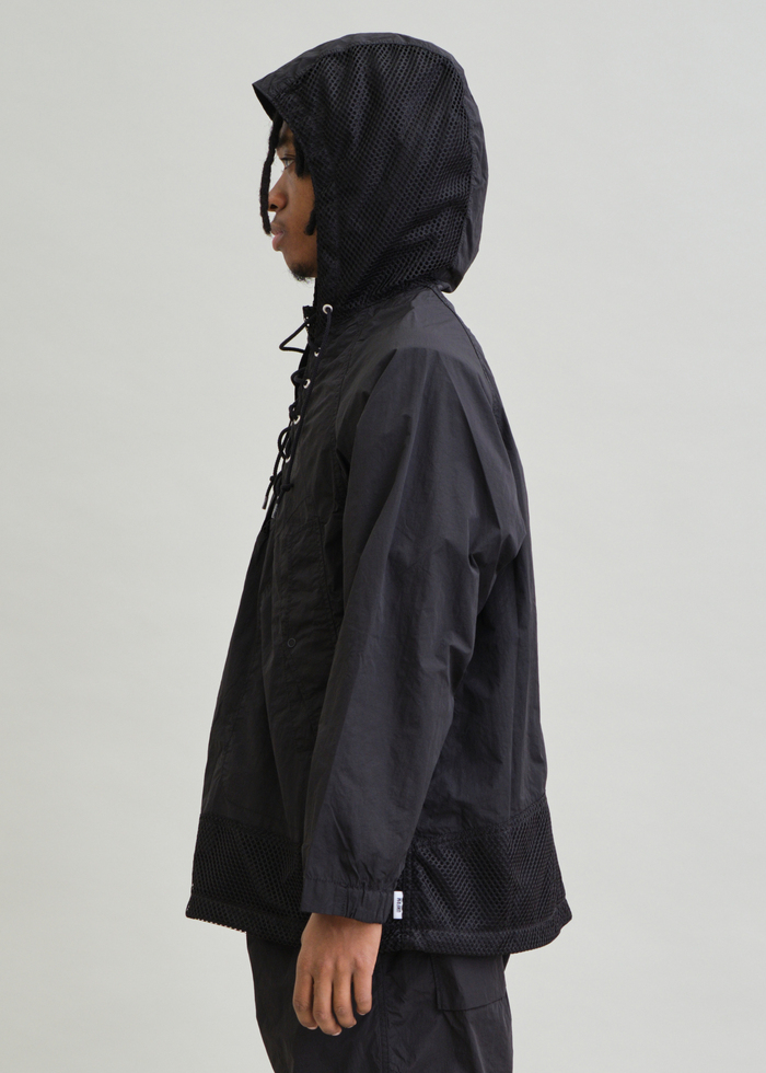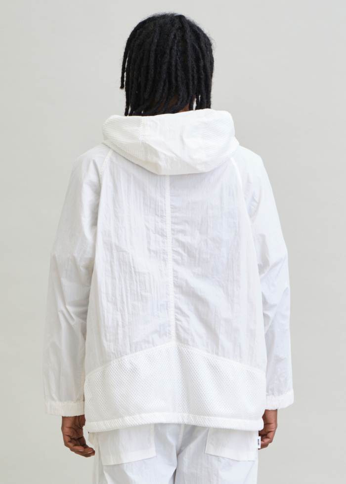 ブランドスタート以来展開し続けている、デッキパーカーを着想源にした人気アイテム。今季はハリと絶妙なシワ感を持つナイロンタイプライター生地を使用し、ドライなタッチで涼しく着られるプルオーバータイプに仕上げています。また、脇と身頃上部にはメッシュパネルを配し、通気性とデザイン性を両立。ゆったりとしたシルエットに、裾のドローコードでシルエット調整が可能です。軽快な着心地と素材の表情が際立つ、UNFRMらしい一着に仕上げています。