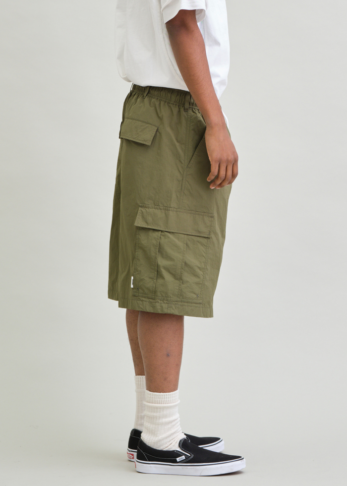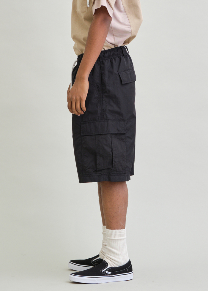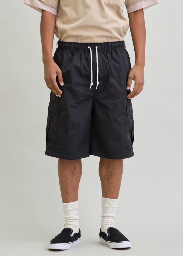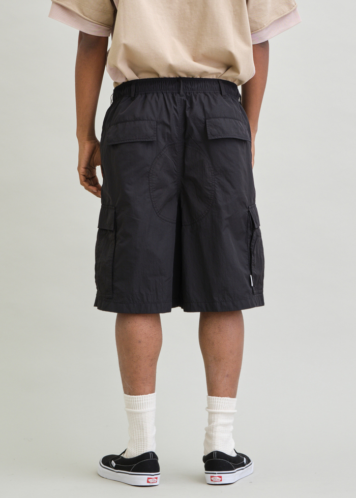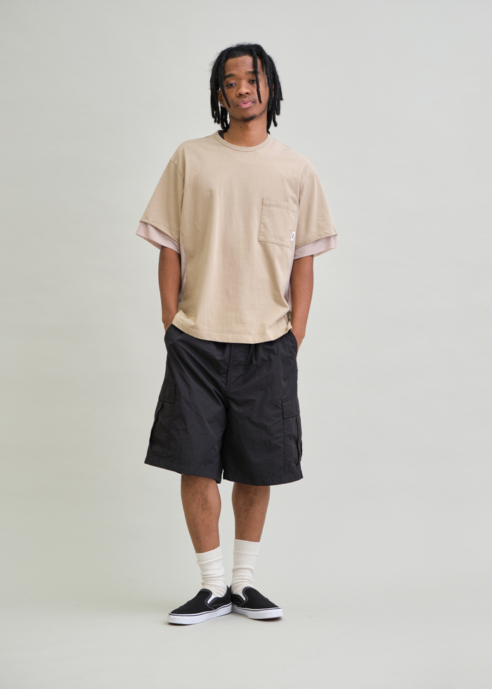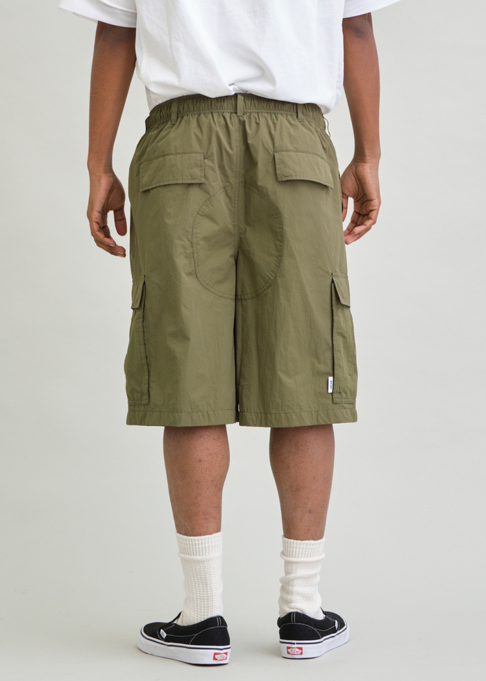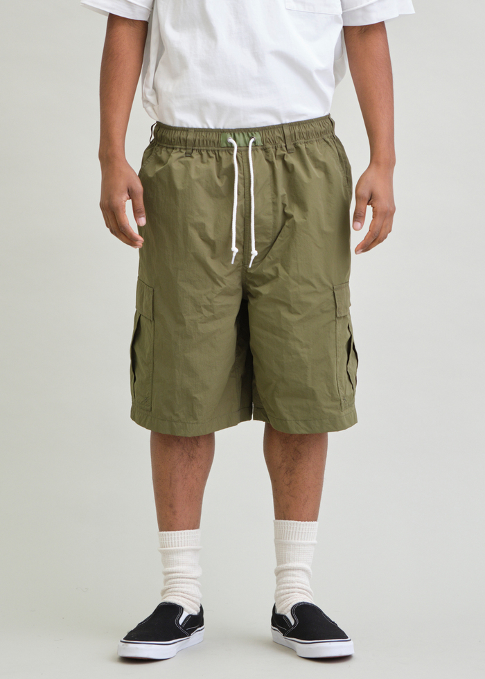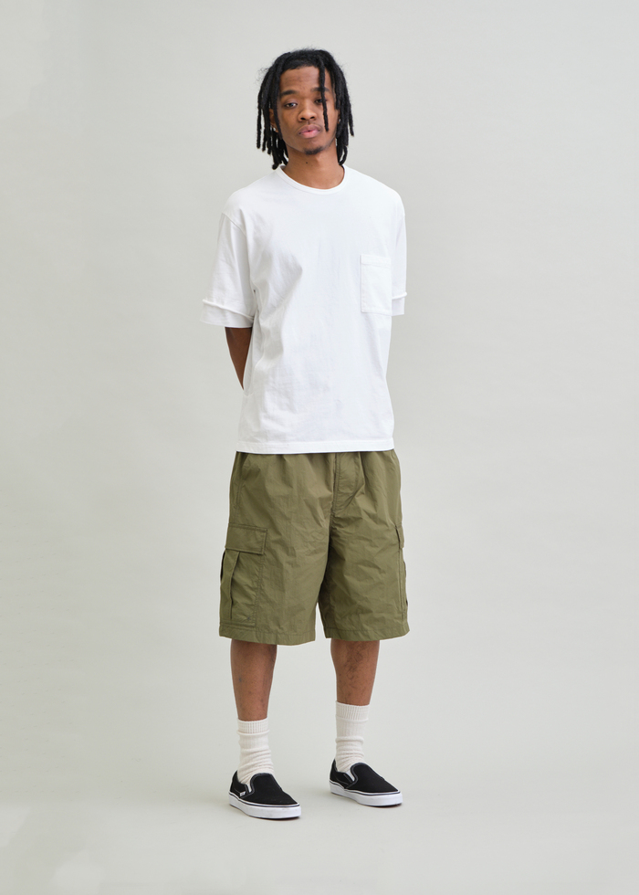 ハリとシワ感が特長のNYLON TYPEWRITERを使用した6分丈のBDUワイドショーツ。