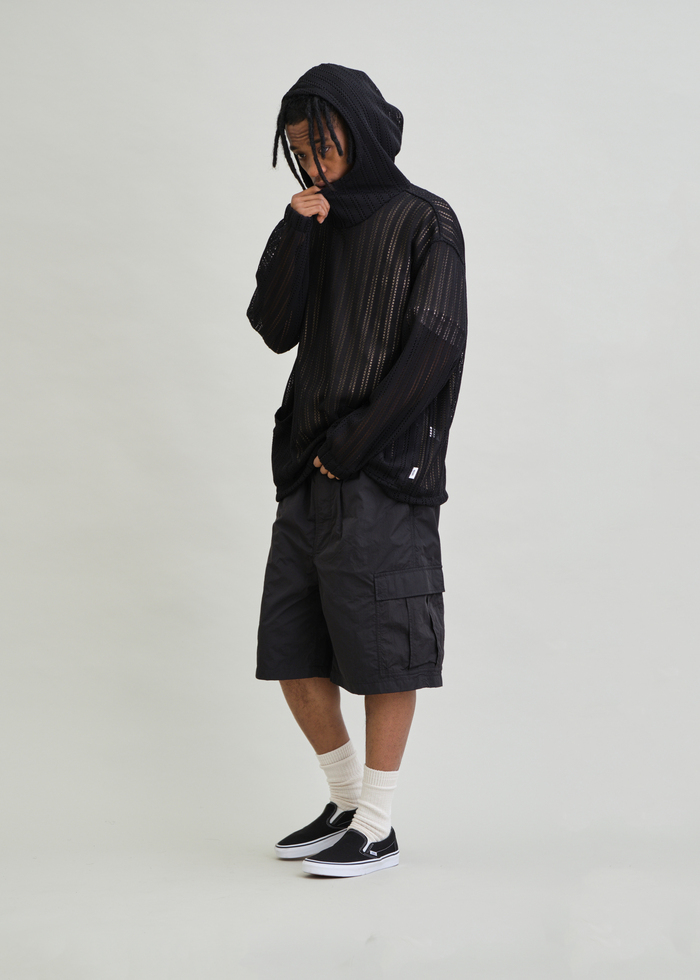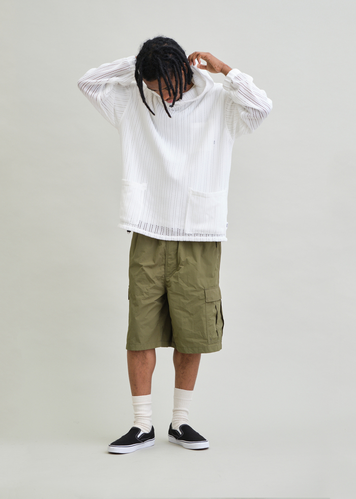 ハリとシワ感が特長のNYLON TYPEWRITERを使用した6分丈のBDUワイドショーツ。裏地は通気性抜群の総メッシュ仕様。7つのポケットを備えた高い収納性と、ベルトループ+スピンドルのイージー仕様で快適なウエスト設計。軽さと強度を兼ね備えた素材感が、夏のスタイリングを快適にサポートするUNFRMらしい一本です。