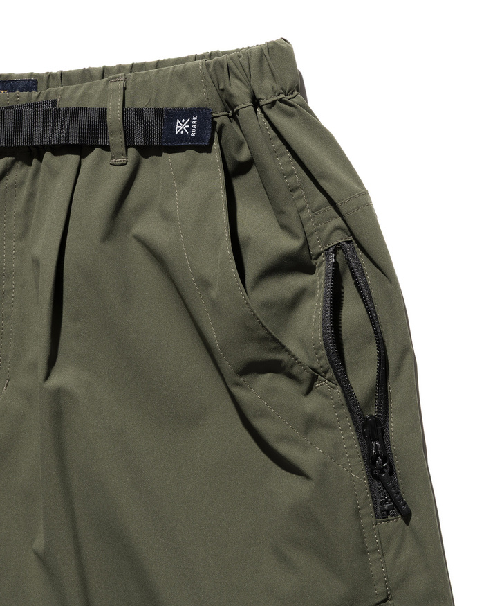 環境負荷の低い原料を使用し、ドライな質感で透湿・速乾・耐摩耗・ストレッチ・撥水・耐久性の機能を併せ持つROARK独自開発ファブリック"ROAM FREE FLEX" を採用した、TRAVEL PANTS 2.0 。従来のTRAVEL PANTSに、磁石で開閉が容易になったスマートフォン用サイドポケットや、ポケット内部にコインポケットを追加しました。180度自然な開脚が可能なガゼットクロッチ、象徴的なバーティカルジップポケット、片手でも調整可能なベルトの仕様など高い機能性も併せ持ちます。ウェービングベルトにはROARKのブランドアイコン、バックポケットにはブランドロゴがあしらわれています。RELAX FIT は太めのシルエットながら裾にかけて自然に細くなる履きやすいテーパードシルエットのフィッティングラインです。