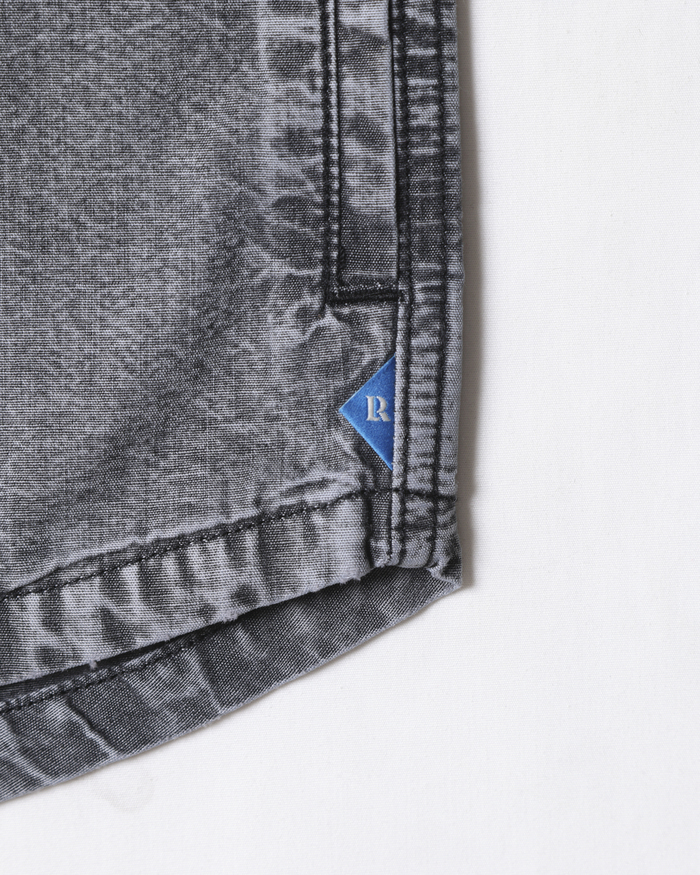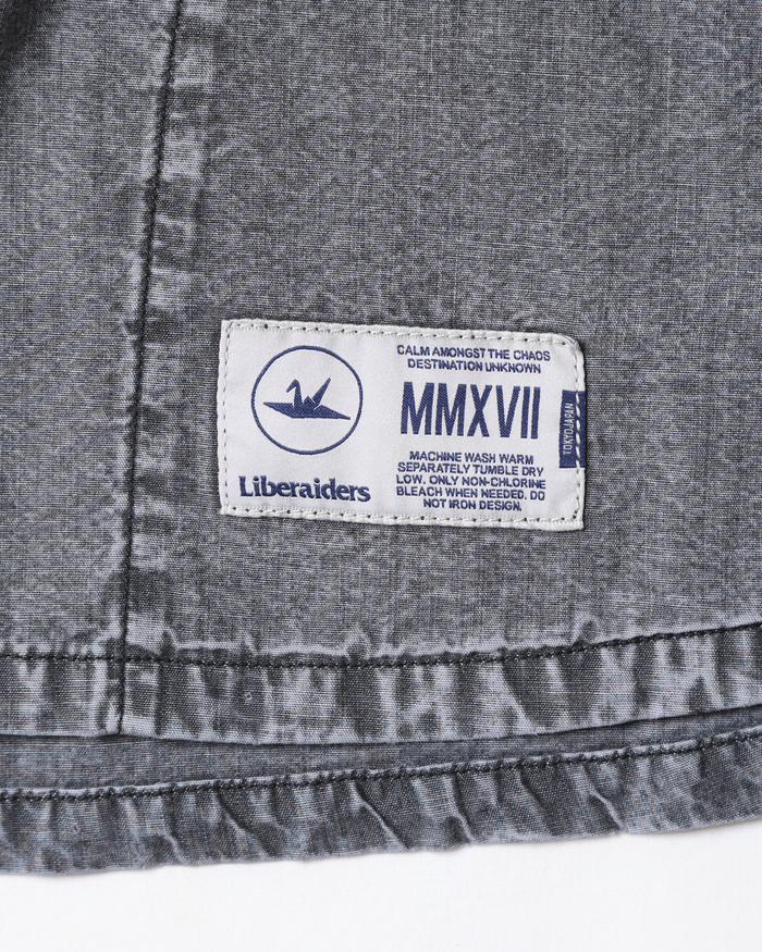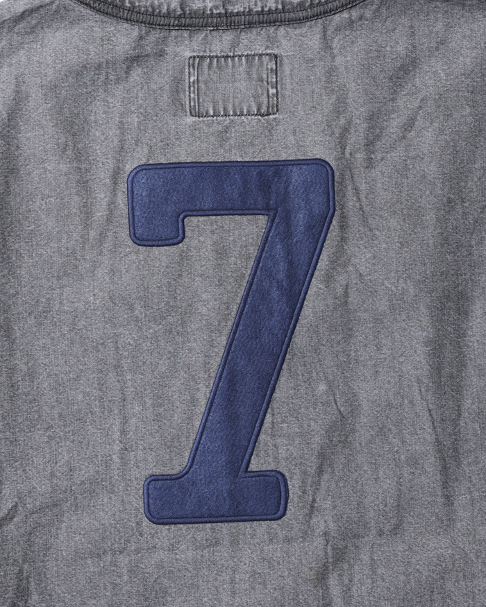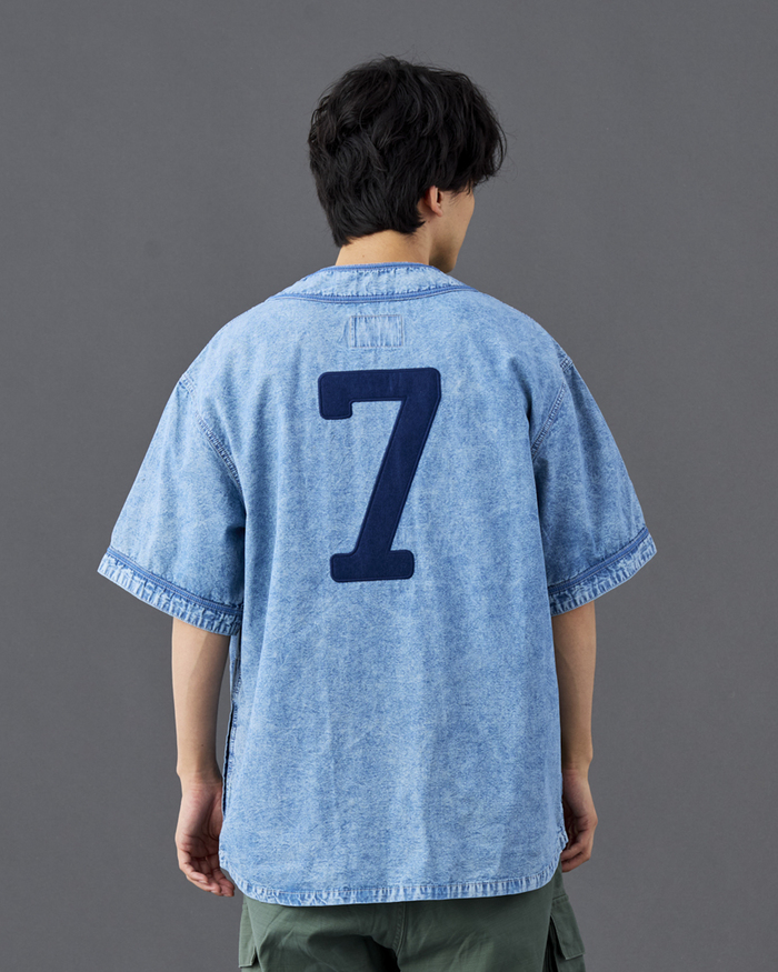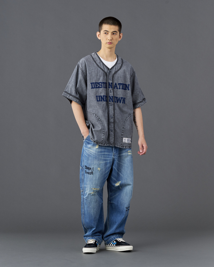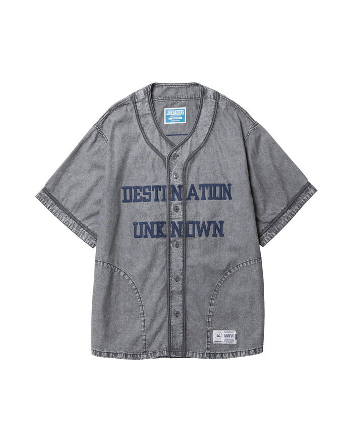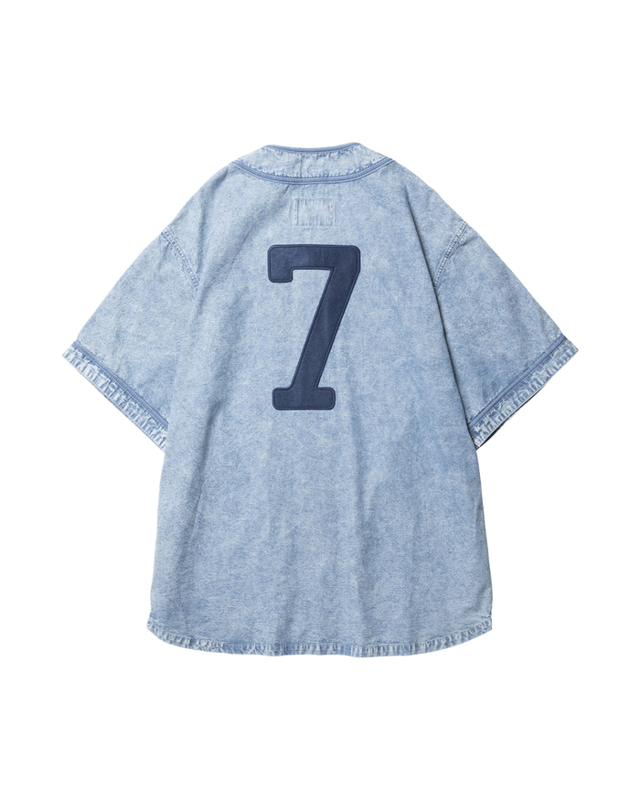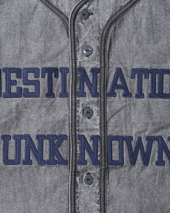 打ち込みのよい国産シャンブレーを使用したベースボールシャツ。フロントにはDESTINATION UNKNOWNのフェルトパッチが入ります。背面には7番のナンバリングフェルトパッチが入ります。左前裾にはスポーツラベルが付きます。両脇にハンドポケット付きます。全体にムラ感のあるブリーチ加工が特徴です。