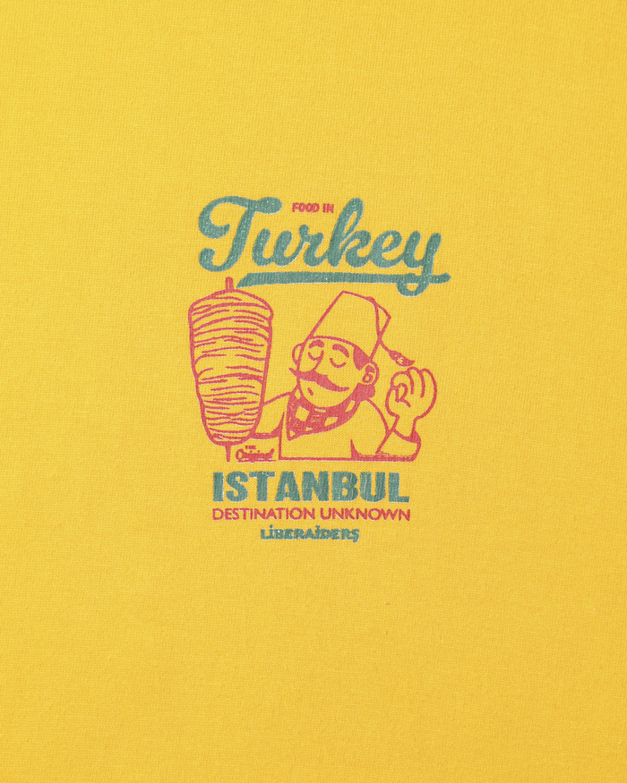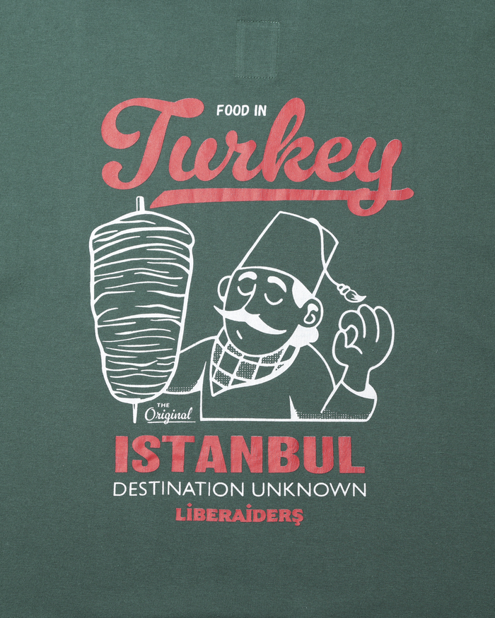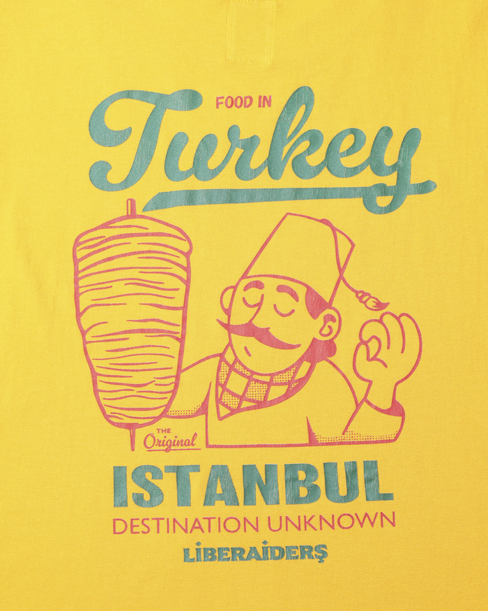 6.2ozの天竺を使用したS/S TEE。ワンウォッシュ加工。胸と背面にトルコを代表するケバブとシェフのグラフィックをプリントしたTシャツ。