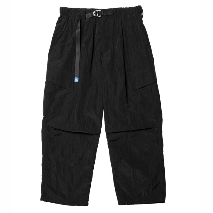 パンツはタック入りのボリュームのあるシルエットが特徴で、斜めフラップのサイドポケットが付きます。ウエストはストラップで片手フィッティングできる仕様です。裾はドローコードで絞れる仕様です。